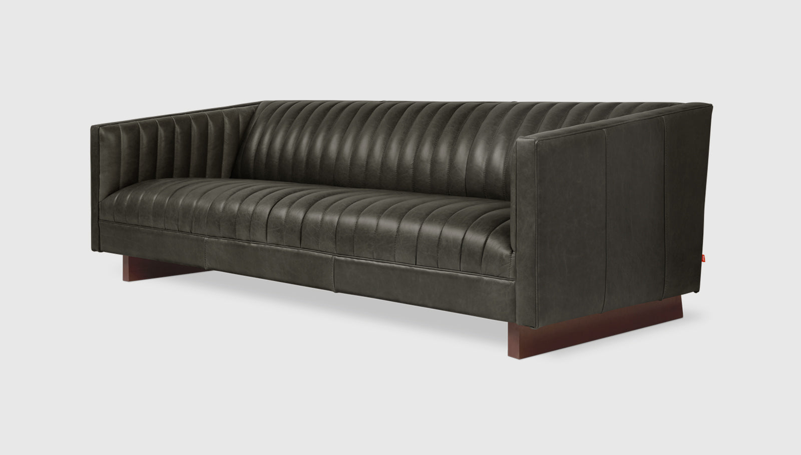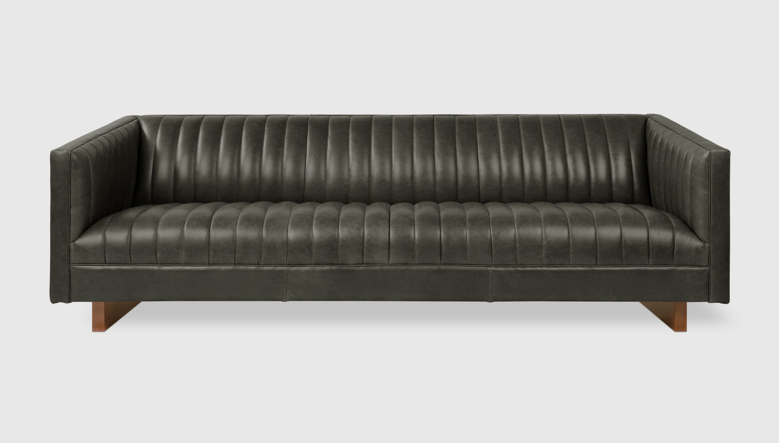 The Wallace Sofa is a modern reinterpretation of the classic English Chesterfield design. The channel-stitched leather upholstery on the seat, back, and arms creates a surface that is both visually striking and remarkably comfortable. Piping details, sloping armrests and an angular wooden base add sculptural, contemporary flair, while luxurious channeled padding make it perfect for lounging. Available in two classic leathers, chosen for their unique grain characteristics that will age beautifully and develop a rich natural patina over time. Matches perfectly with the Wallace Chair. Our leather hides are carefully selected for their raw, natural surface characteristics which make each piece unique.
