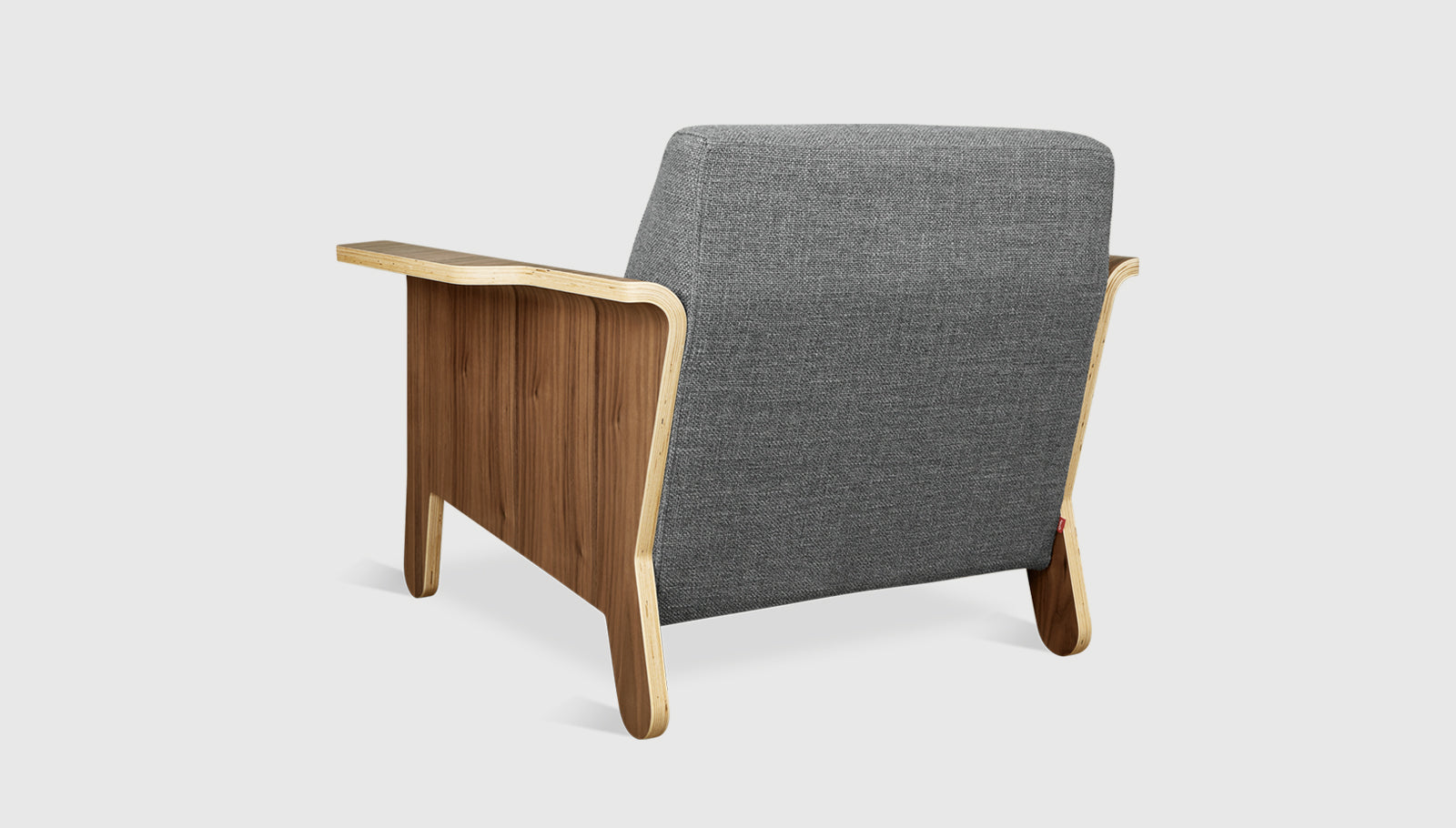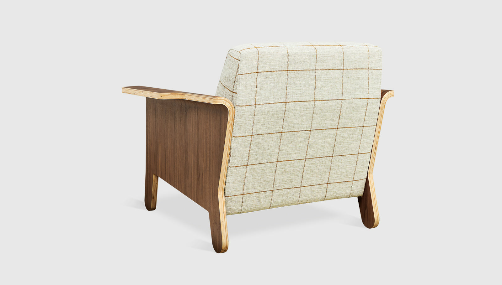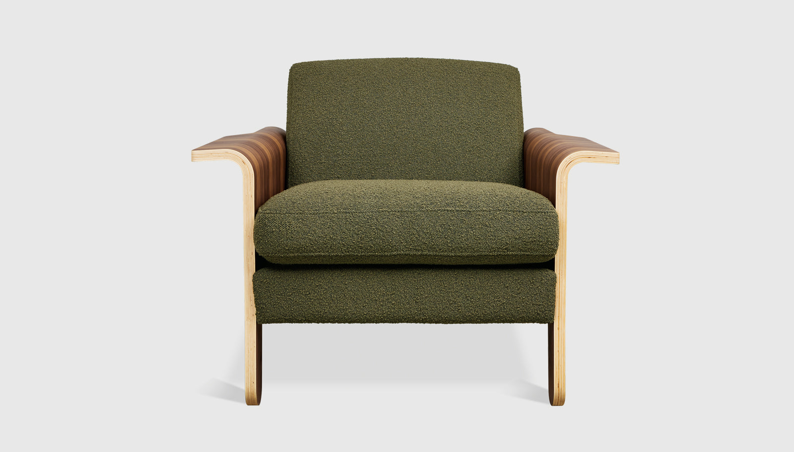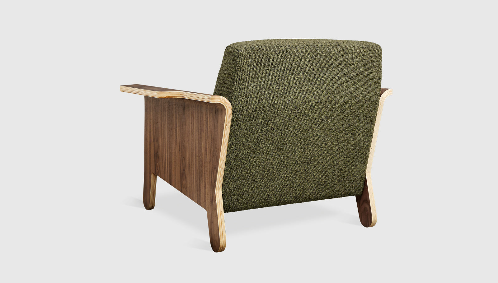 The Lodge Chair is a contemporary club chair with playful, bent-ply arms and a sculptural profile that creates an alluring imprint on any space. This unique design is available with fabric or Vegan AppleSkin™ Leather upholstery to contrast a warm, Walnut-finished exterior frame. The inner frame is constructed with kiln-dried FSC®-Certified hardwood, in support of responsible forest management.