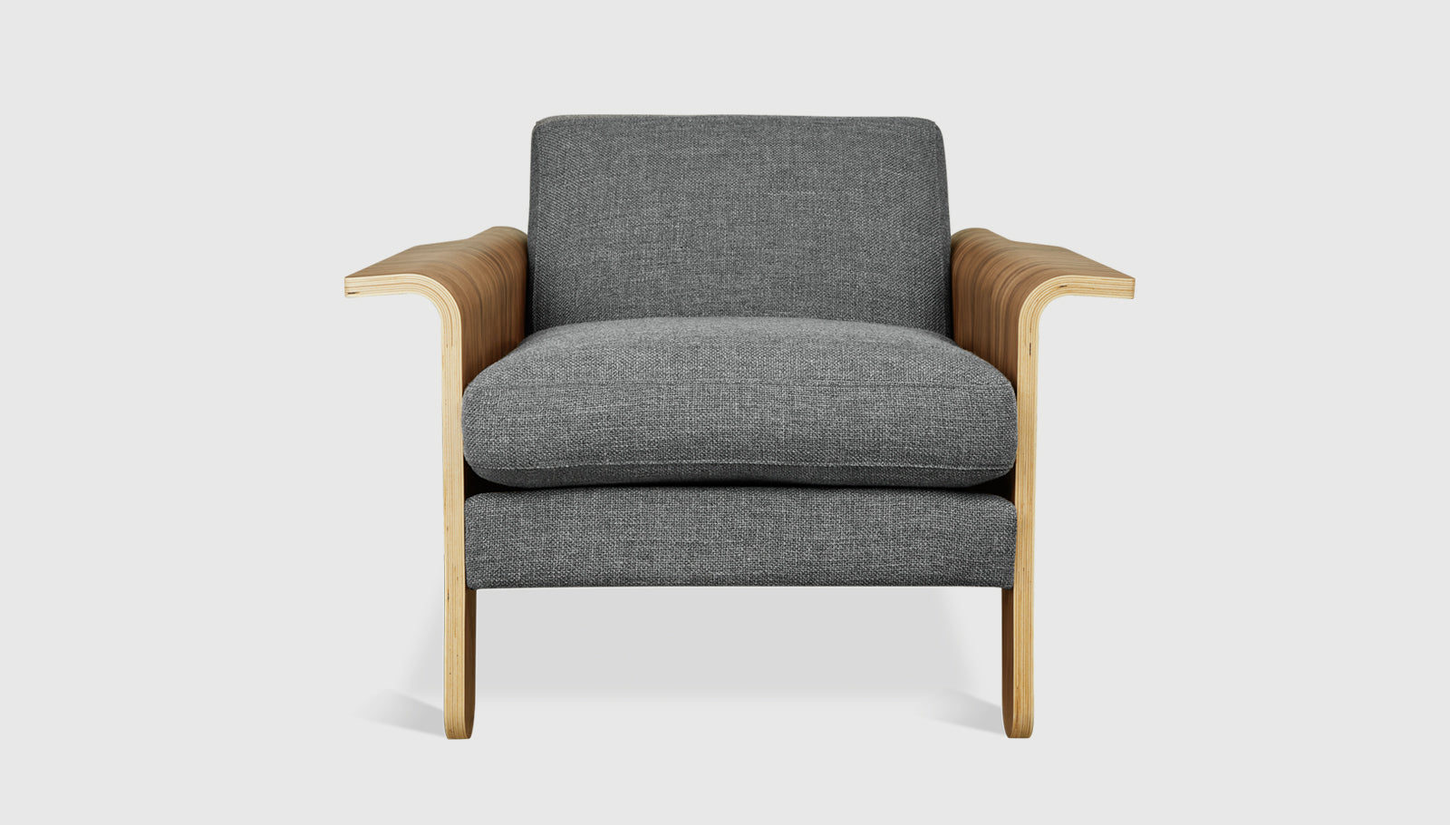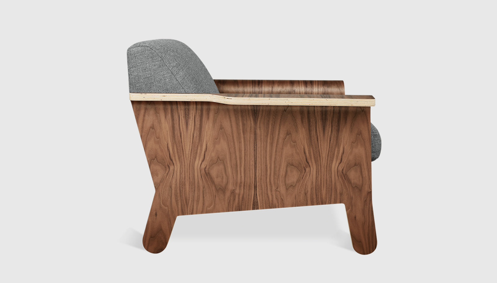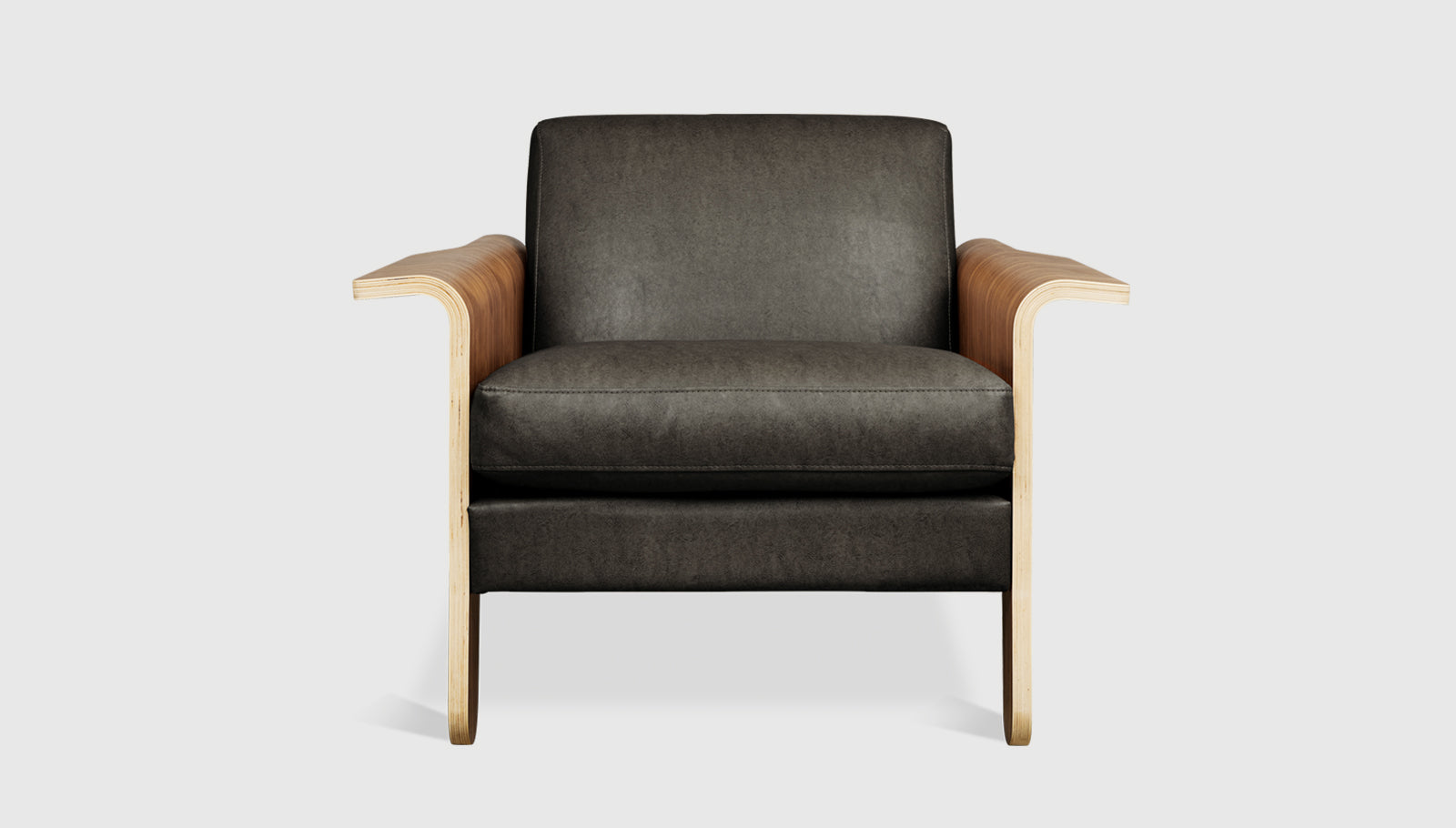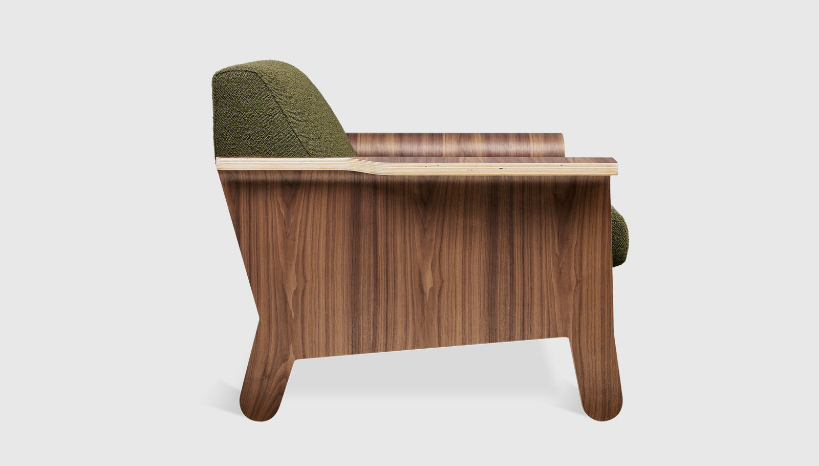 The Lodge Chair is a contemporary club chair with playful, bent-ply arms and a sculptural profile that creates an alluring imprint on any space. This unique design is available with fabric or Vegan AppleSkin™ Leather upholstery to contrast a warm, Walnut-finished exterior frame. The inner frame is constructed with kiln-dried FSC®-Certified hardwood, in support of responsible forest management.
