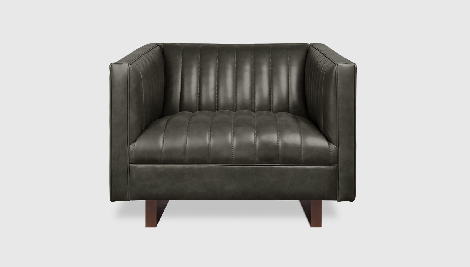 The Wallace Chair is a modern reinterpretation of the classic English Chesterfield design. The channel-stitched leather upholstery on the seat, back, and arms creates a surface that is both visually striking and remarkably comfortable. Piping details, sloping armrests and an angular wooden base add sculptural, contemporary flair, while luxurious channeled padding make it perfect for lounging. Available in two classic leathers, chosen for their unique grain characteristics that will age beautifully and develop a rich natural patina over time. Matches perfectly with the Wallace Sofa. Our leather hides are carefully selected for their raw, natural surface characteristics which make each piece unique.