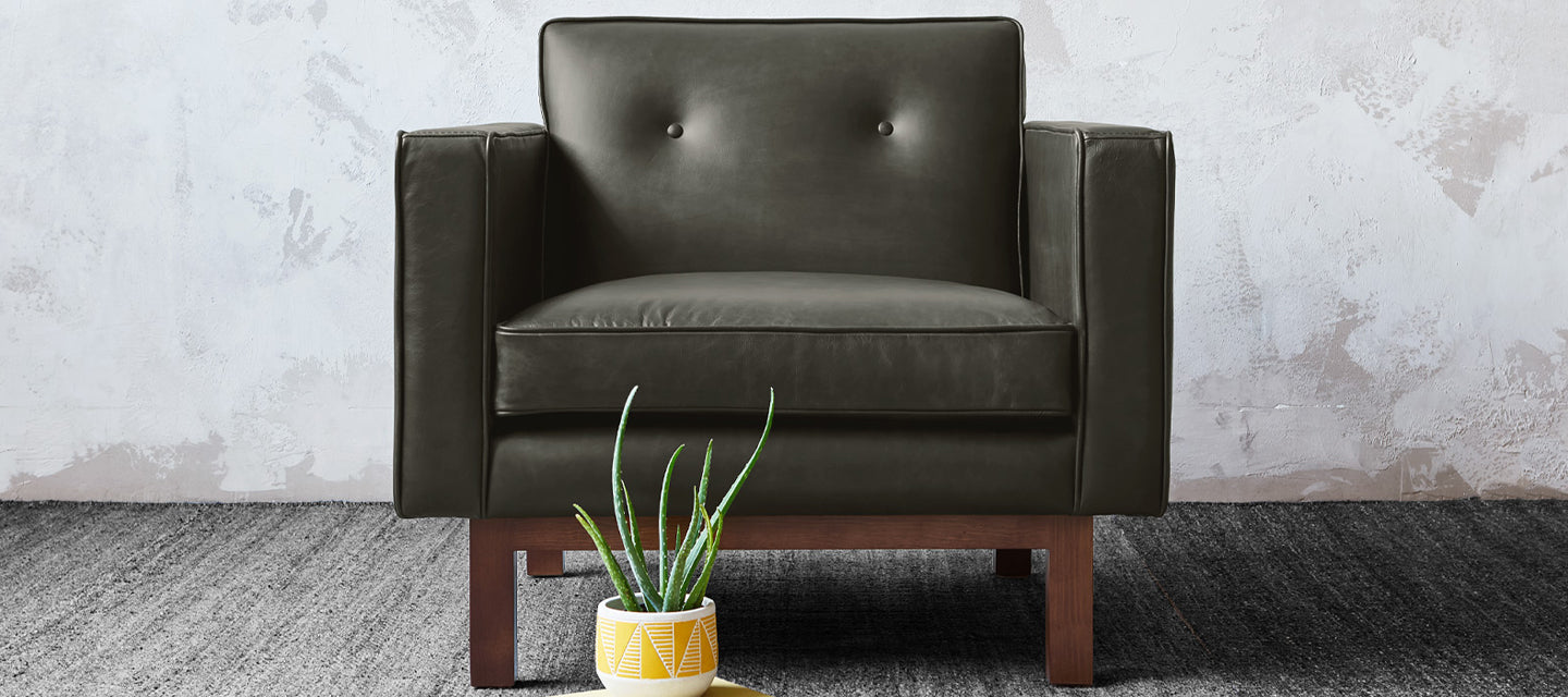 The Embassy Chair conveys a classic, mid-century style with tailored proportions and refined details. It features a button-tufted, tight back design with piping details throughout, and a seat cushion filled with luxurious synthetic-down. The frame is supported by a recessed, solid-wood base. Available in two classic leathers, chosen for their unique grain characteristics that will age beautifully and develop a rich, natural patina over time. Also available as a sofa. Our leather hides are carefully selected for their raw, natural surface characteristics which make each piece unique.